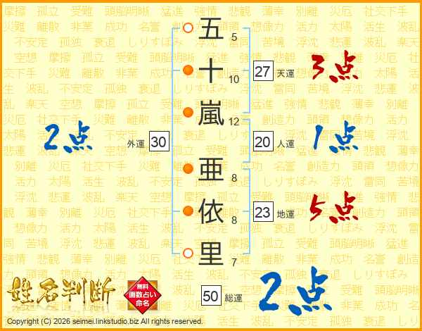 五(5画)十(10画)嵐(12画) 亜(8画)依(8画)里(7画)