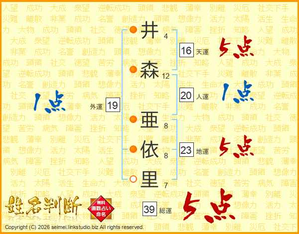 井(4画)森(12画) 亜(8画)依(8画)里(7画)