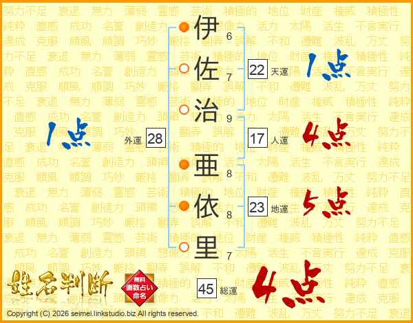 伊(6画)佐(7画)治(9画) 亜(8画)依(8画)里(7画)