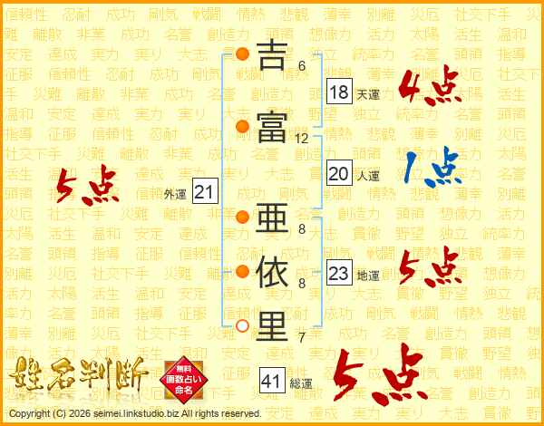 吉(6画)富(12画) 亜(8画)依(8画)里(7画)