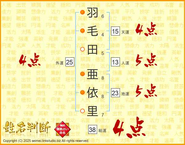 羽(6画)毛(4画)田(5画) 亜(8画)依(8画)里(7画)
