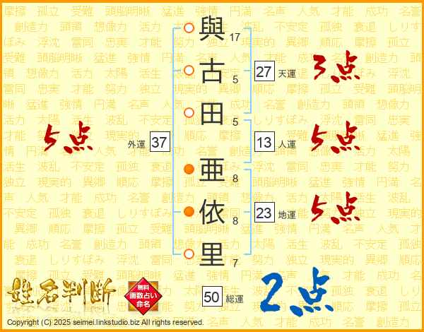 與(17画)古(5画)田(5画) 亜(8画)依(8画)里(7画)