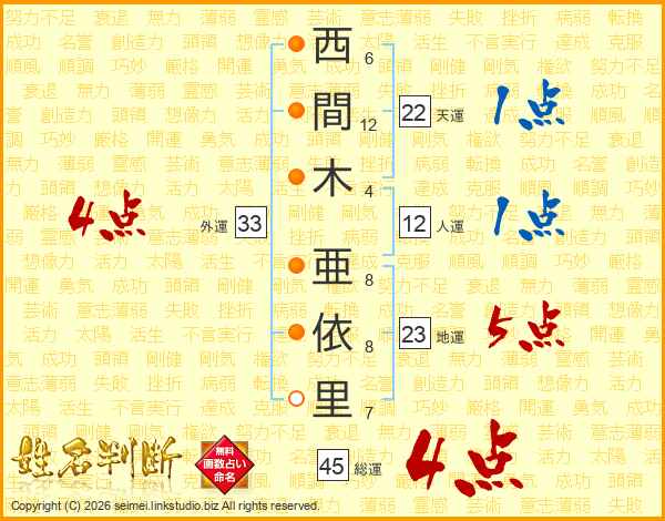 西(6画)間(12画)木(4画) 亜(8画)依(8画)里(7画)