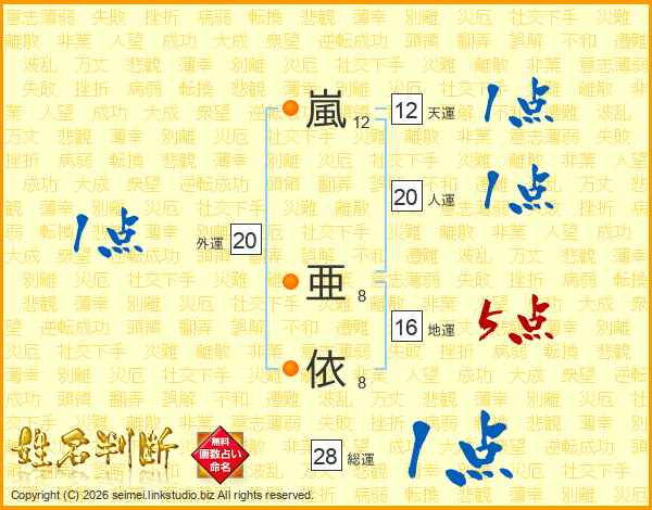 生活面を象徴する運勢です。外部から受ける影響力を表し、結婚運、家庭運や職場、環境への順応性を表します。総運から人運を引いた画数。姓や名が1文字の場合を除く。