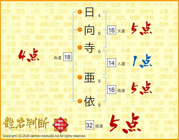 日(4画)向(6画)寺(6画) 亜(8画)依(8画)