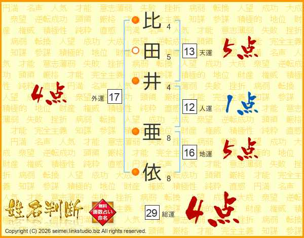 比(4画)田(5画)井(4画) 亜(8画)依(8画)