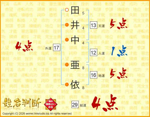 田(5画)井(4画)中(4画) 亜(8画)依(8画)
