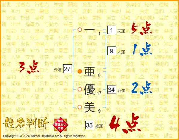 画数の奇数(○陽)と偶数(●陰)の配列で吉凶を占います。どちらかにかたよる名前は大凶名で避ける必要があります。画数の奇数偶数。