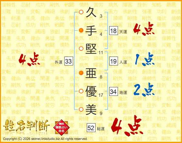 久(3画)手(4画)堅(11画) 亜(8画)優(17画)美(9画)