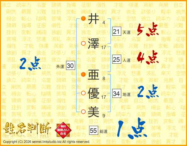 井(4画)澤(17画) 亜(8画)優(17画)美(9画)