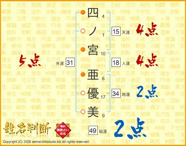 四(4画)ノ(1画)宮(10画) 亜(8画)優(17画)美(9画)