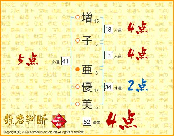 増(15画)子(3画) 亜(8画)優(17画)美(9画)