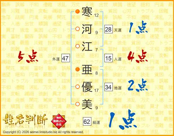 寒(12画)河(9画)江(7画) 亜(8画)優(17画)美(9画)