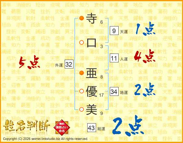 寺(6画)口(3画) 亜(8画)優(17画)美(9画)