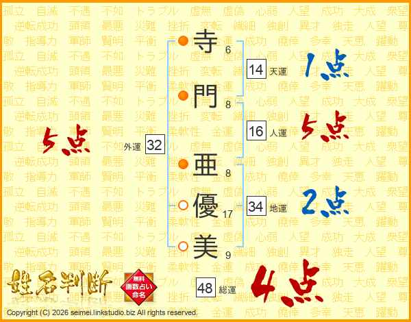 寺門亜優美さんの外運は32画の5点!