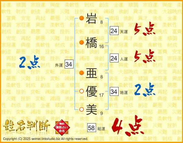 岩(8画)橋(16画) 亜(8画)優(17画)美(9画)