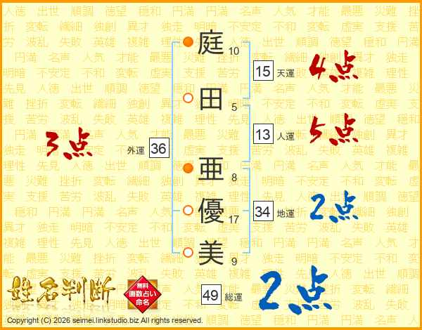 庭(10画)田(5画) 亜(8画)優(17画)美(9画)