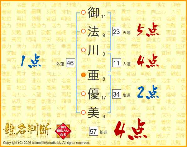 御(11画)法(9画)川(3画) 亜(8画)優(17画)美(9画)