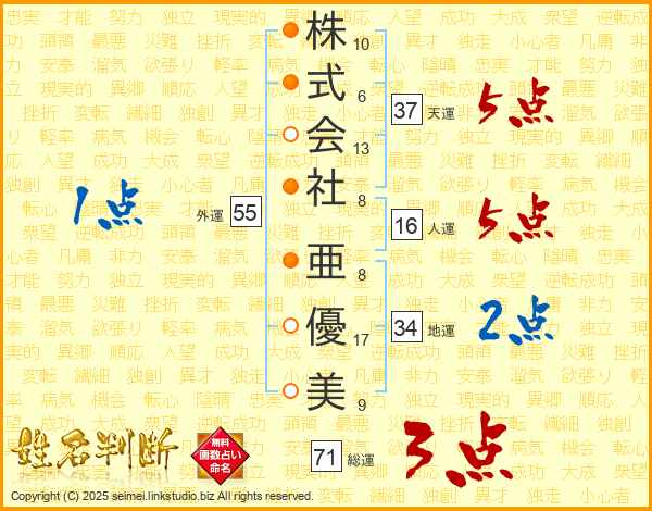 株式会社亜優美さんの天運は37画の5点!