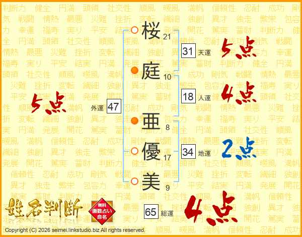 桜(21画)庭(10画) 亜(8画)優(17画)美(9画)