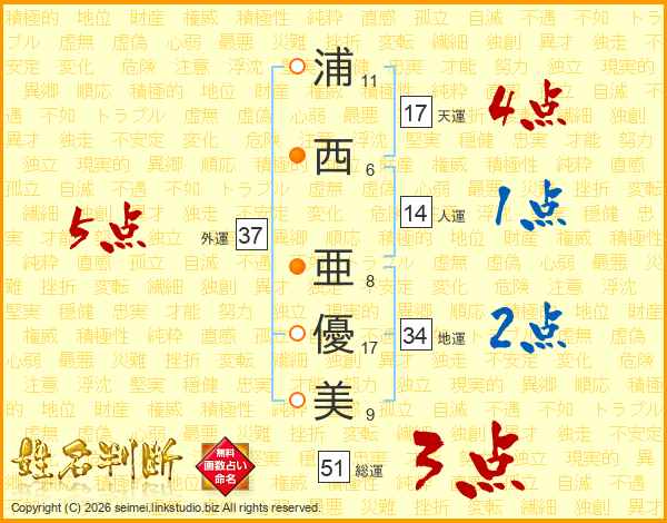 浦(11画)西(6画) 亜(8画)優(17画)美(9画)