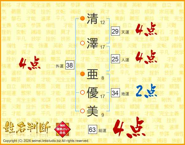 清(12画)澤(17画) 亜(8画)優(17画)美(9画)