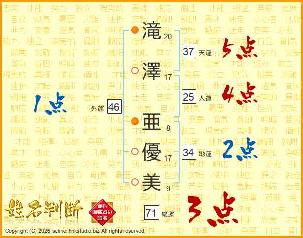 滝(20画)澤(17画) 亜(8画)優(17画)美(9画)