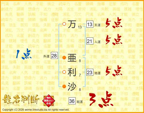 万亜利沙さんの天運は13画の5点!