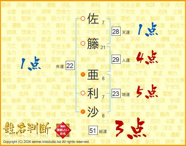 佐籐亜利沙さんの総運は51画の3点!
