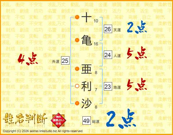 十(10画)亀(16画) 亜(8画)利(7画)沙(8画)