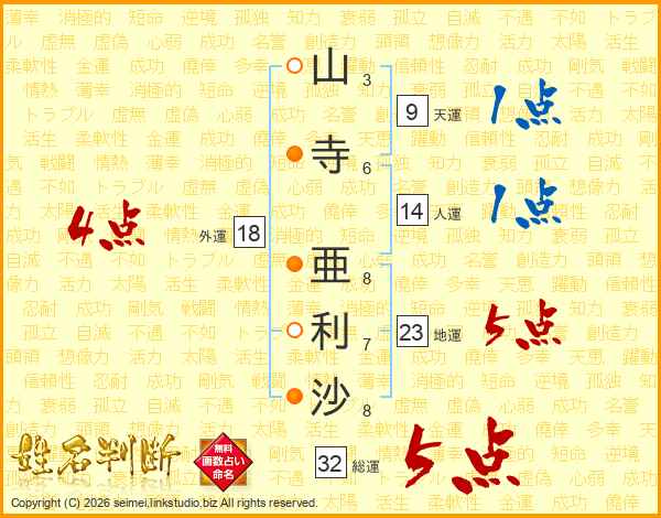 山(3画)寺(6画) 亜(8画)利(7画)沙(8画)