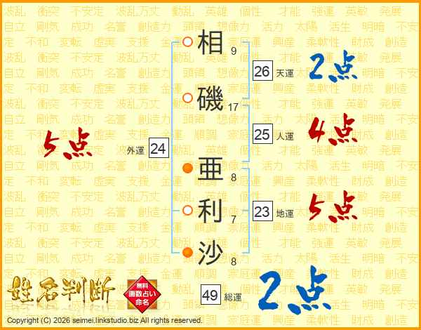 相(9画)磯(17画) 亜(8画)利(7画)沙(8画)