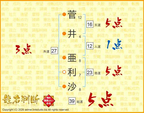 菅(12画)井(4画) 亜(8画)利(7画)沙(8画)