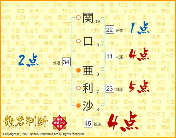 関(19画)口(3画) 亜(8画)利(7画)沙(8画)