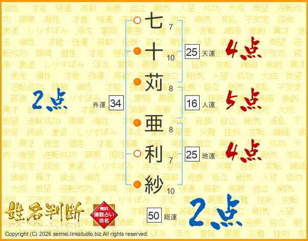 七(7画)十(10画)苅(8画) 亜(8画)利(7画)紗(10画)