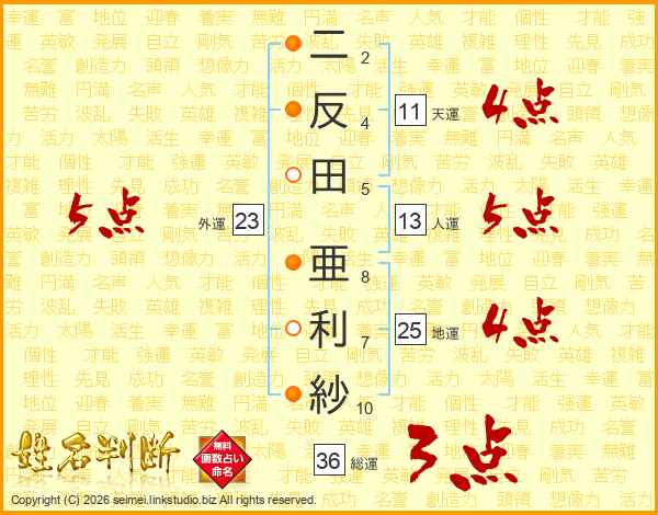 生活面を象徴する運勢です。外部から受ける影響力を表し、結婚運、家庭運や職場、環境への順応性を表します。総運から人運を引いた画数。姓や名が1文字の場合を除く。