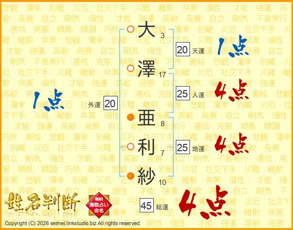 大(3画)澤(17画) 亜(8画)利(7画)紗(10画)