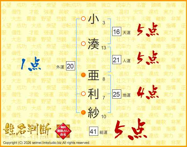 小(3画)湊(13画) 亜(8画)利(7画)紗(10画)