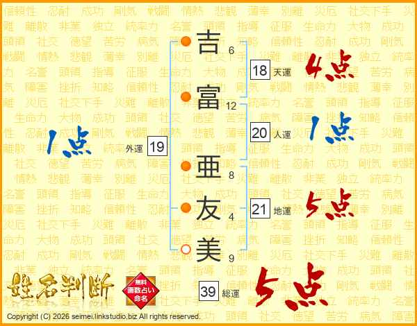 吉(6画)富(12画) 亜(8画)友(4画)美(9画)