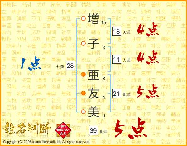 増(15画)子(3画) 亜(8画)友(4画)美(9画)