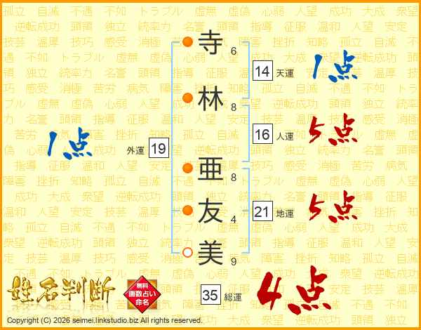 寺(6画)林(8画) 亜(8画)友(4画)美(9画)
