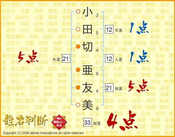 小田切亜友美さんの総運は33画の4点!