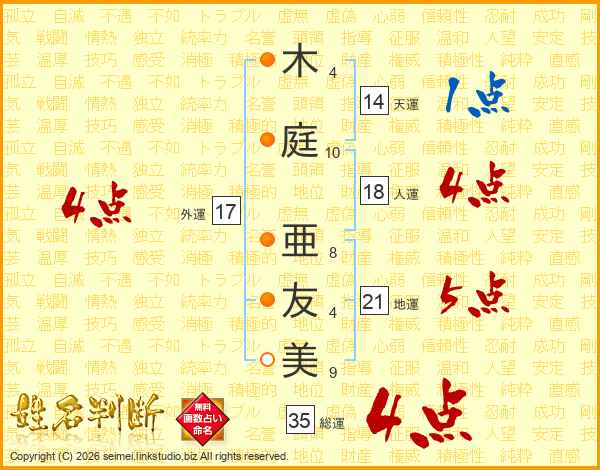 木(4画)庭(10画) 亜(8画)友(4画)美(9画)