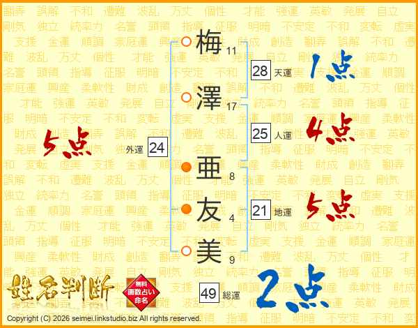 梅(11画)澤(17画) 亜(8画)友(4画)美(9画)