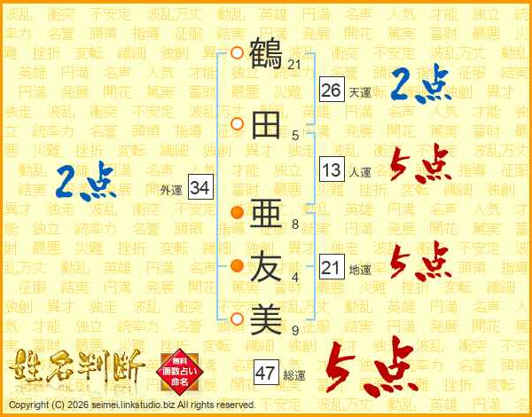 鶴(21画)田(5画) 亜(8画)友(4画)美(9画)