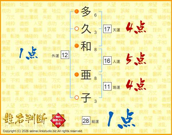多(6画)久(3画)和(8画) 亜(8画)子(3画)