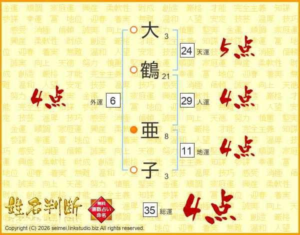 大(3画)鶴(21画) 亜(8画)子(3画)