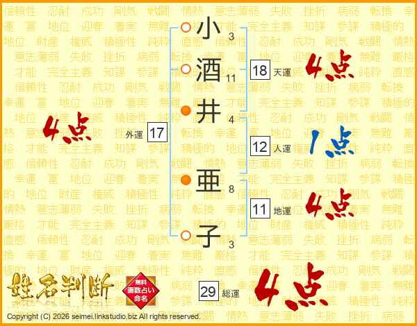 小(3画)酒(11画)井(4画) 亜(8画)子(3画)