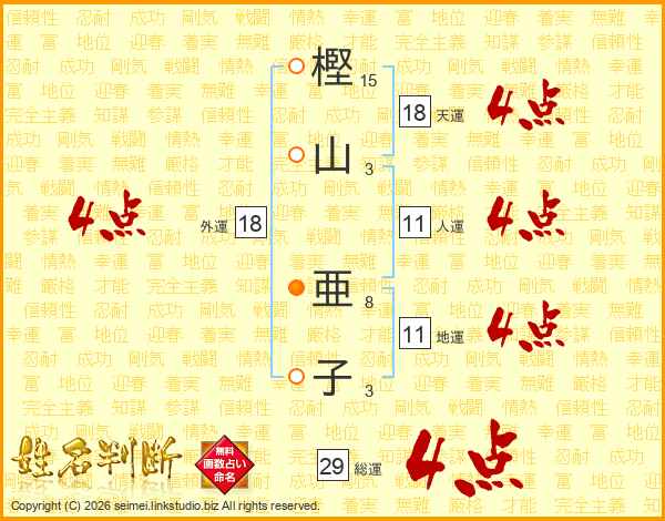 あなたの人生を表す1番重要な運勢です。生涯を通じて影響する総合運となり、主に50歳以降の晩年期に影響を及ぼします。苗字と名前の合計画数。