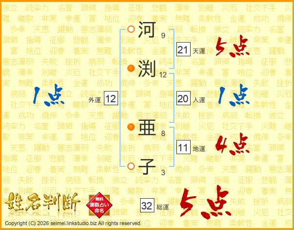 生活面を象徴する運勢です。外部から受ける影響力を表し、結婚運、家庭運や職場、環境への順応性を表します。総運から人運を引いた画数。姓や名が1文字の場合を除く。